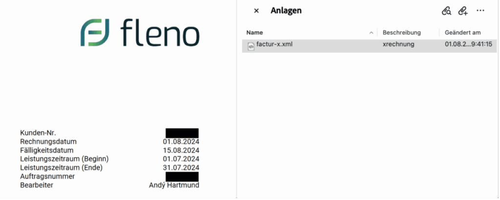 - Format: Die E-Rechnung muss den Anforderungen der europäischen Norm EN 16931 entsprechen. Die gängigen Formate sind XRechnung und ZUGFeRD 2.x. Zumeist wird die Maschinenleserliche Rechnung als Anhang der PDF-Rechnung angehängt und ist für den ungeübten Betrachter auf den ersten Blick nicht sichtbar.